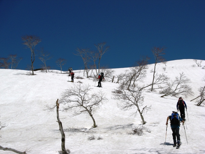 下山し滑り降りた斜面(左が湯殿山)を見ながらまた感動。