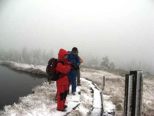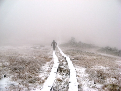 ぬかるんだ登山道をバシャバシャ進むと一面真っ白。