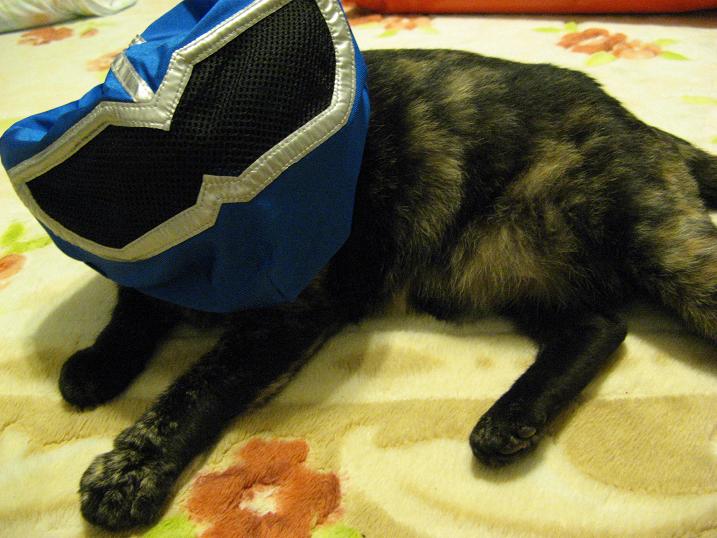 (青レンジャーを袋から出すとクマが…。離れないので一緒に