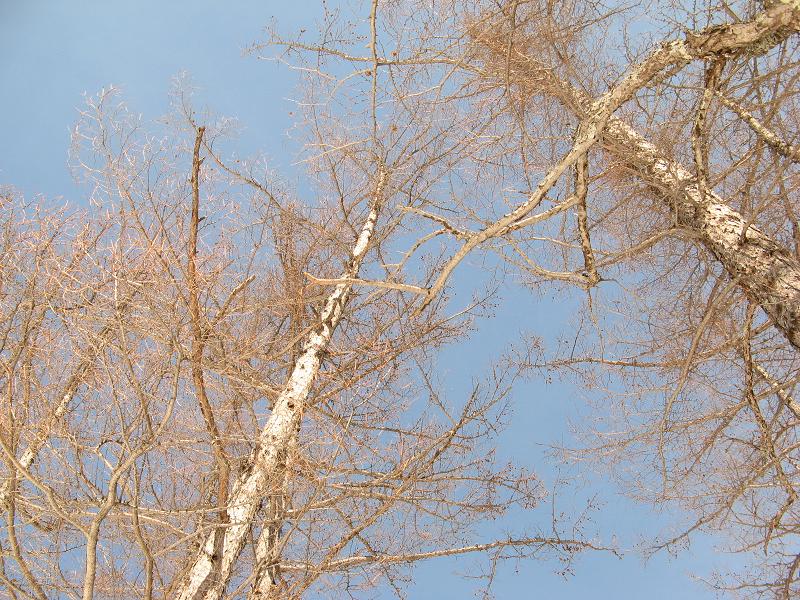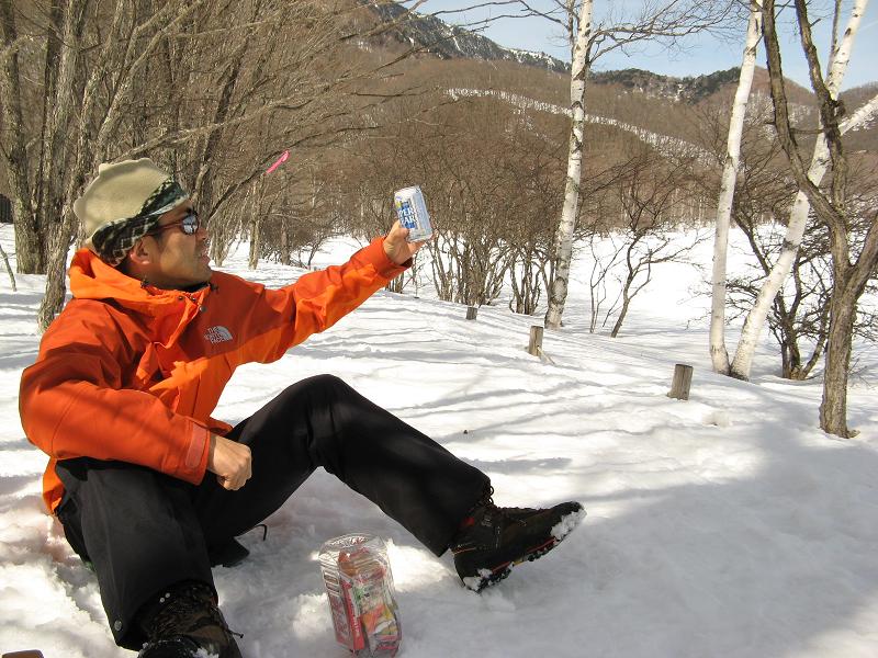50分ぐらいのんびり雪の中を歩いて小田代ヶ原に到着。小田代の貴婦人(1本の白樺)にノンアルコールビール(ビールティスト炭酸飲料)で乾杯し、昼食に。