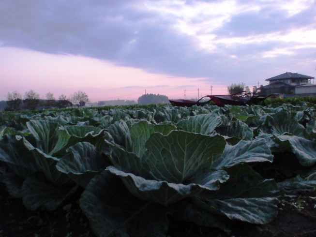 畑いっぱいのキャベツも日の出を待っているかのよう
