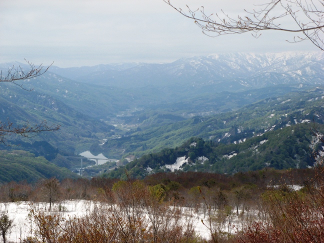 登り疲れて、周囲を見ると新緑と残雪のコントラストが素晴らしい。