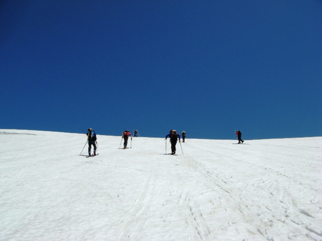 その後はじっくりまた登り始める。山頂が近づいてくる頃滑り降りてくる人も多くなってきた。